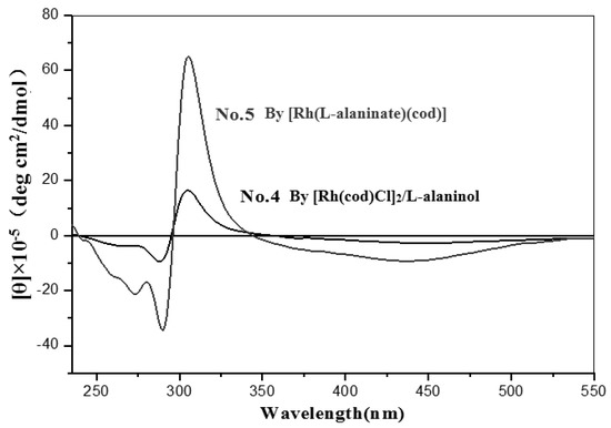The CD spectra of the polymers are shown in Figure 2. The polymers exhibited Cotton effects with molar ellipticity (θ) (deg cm2/dmol) at 310 and 430 nm. The peak at 310 nm may arise from a chiral position between the adjacent pendant groups [11,12]. The absorption band at 430 nm was assigned to the conjugated main chain. Therefore, the polymers had chirality in the main chain, that is, a one-handed helical backbone. The (θ) value of poly (DoDHPA) obtained by using the isolated [Rh(L-alaninate)(cod)] was higher (Figure 2, No. 5) than that of the polymer obtained by using the binary [Rh(cod)Cl]2/(L-alaninol) catalytic system (Figure 2, No. 4). When [Rh(L-alaninate)(nbd)] was used as the catalyst in CH2Cl2 solution, the obtained poly(DoDHPA) showed a greater molar ellipticity [θ] value than [Rh(nbd)Cl]2/(L-alaninol) (Figure S16, Supplementary Materials).