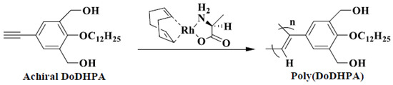 Polymerization: DoDHPA and PA were polymerized by using [Rh(L-alaninate)(cod)] and [Rh(cod)Cl]2. A typical polymerization procedure was as follows: a solution (0.20 mL) of [Rh(L-alaninate)(cod)] (0.17 mg, 0.577 μmol) in dry toluene was added to a dry toluene solution (0.40 mL) of DoDHPA (20.00 mg, 57.700 μmol). Polymerization was performed at 35 °C for 24 h. The formed polymer was isolated by precipitation in a large amount of methanol, centrifuged and dried under vacuum to a constant weight. 1H NMR (600 MHz, 1,2-dichlorobenzene-d4, TMS, δ): 7.33 (s, 2H, PhH), 6.18-5.63 (m, 1H, PhC=CH), 4.95 (s, 4H, CH2OH), 4.06 (t, 2H, OCH2CH2), 1.77 (t, 2H, CH2OH), 1.59 (s, 2H, OCH2CH2CH2), 1.11-1.23 (m, 18H, OC2H4(CH2)9CH3), 0.53 (t, 3H, CH3) (Figure S9, Supplementary Materials). IR (KBr): 3351.22, 2924.05, 2853.28, 1603.86, 1464.87, 1382.03, 1352.11, 1299.25, 1211.92, 1150.04, 1069.08, 1042.90, 986.98, 913.62, 835.98 cm−1 (Figure S10, Supplementary Materials).