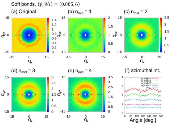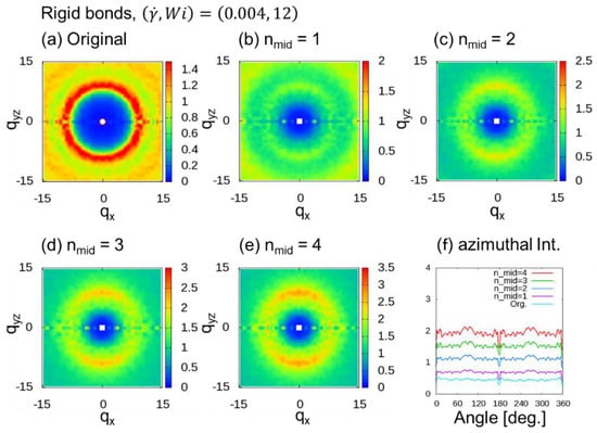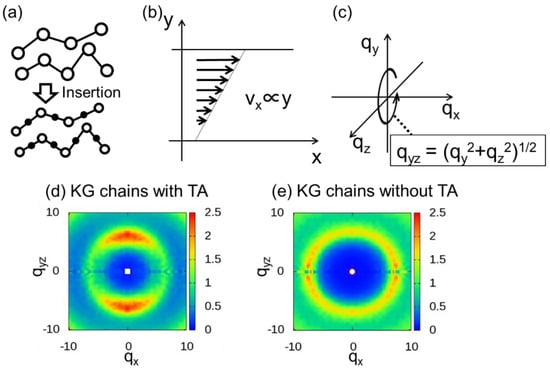 Schematic illustrations of (a) the thinning approximation (TA) process; (b) the velocity profile obtained at a constant shear rate; and (c) the circular average; two-dimensional scattering patterns (2DSPs) of Kremer–Grest (KG) chains under shear flow (d) with TA and (e) without TA. The presented 2DSPs were partially reprinted from an earlier paper, Hagita, K.; Murashima, T.; Takano, H.; Kawakatsu, T. J. Phys, Soc. Jpn. 2017, 86, 124803. [44], with the permission.