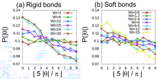 In rheology [60], the orientation of the bond vector of a polymer chain in melts under shear can be characterized by the Weisenberg number, Wi, which is defined as the product of the longest relaxation time, , and the shear rate, : . For the excluded-volume chain system that prohibits bond crossings, orientation is believed to take place when Wi > 1. For systems allowing bond crossings in DPD simulations, the threshold value of Wi is considered to change, so it is necessary to directly investigate this value. For various shear rates, , the probability, of the bond orientation parameter, , was estimated, where is given by . Before simulations under shear were carried out, we estimated the longest Rouse relaxation time, , of a chain in the melt for the calculation of . For the case with N = 100 beads per chain, is about 1200 and 3000 (where τ is the reduced unit of time, for the simulations of dense polymer melts with rigid and soft bonds, respectively. Figure 2 shows histograms of the probabilities versus for rigid and soft bonds, where is the floor function of . In our previous study [44] on the KG model, when the orientation distribution with increased by about 10% compared to that at the stationary state (), two spot patterns originating from shear deformation were observed. Therefore, in the present study, we investigated of the DPD simulations in which with increases by about 10%. We found that with increases by more than ~10% when the value of is larger than 12 for the case with rigid bonds and when is larger than 6 for the case with soft bonds. In this study, we examined the cases with , and for rigid bonds and with and for soft bonds.