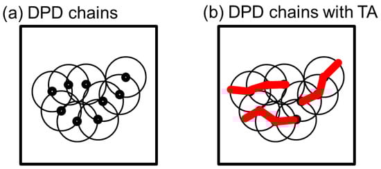 Schematic illustrations of (a) DPD chains and (b) additional midpoints for thinning approximation of a dense polymer melt. The circles denote the overlapping DPD particles. The red bold lines in (b) denote the series of additional midpoints. Based on the approximation, a clear picture of the chains was obtained.
