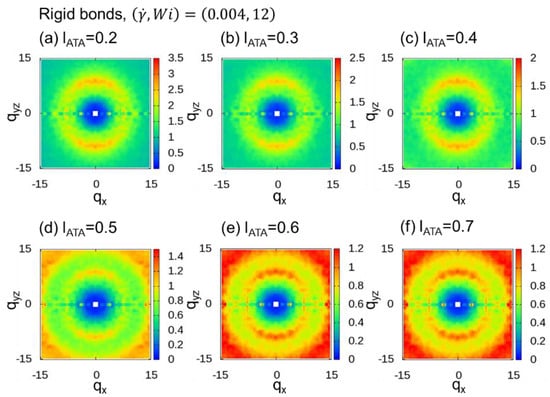 Figure 6 shows 2DSPs for the cases with When , two spot patterns originating from the bond orientation were observed, and they are clearer than the patterns shown in Figure 5. Even in this case, the two spot patterns were not observed when . Therefore, for the case of DPD simulations with rigid bonds, at least two additional midpoints () were necessary.