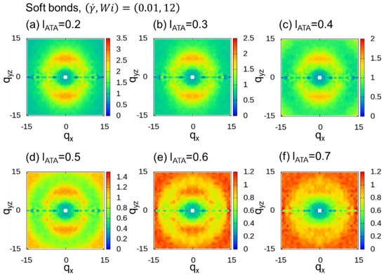 Dissipative particle dynamics (DPD) [1,2,3] simulations are widely performed in order to study the dynamic and rheological properties of simple and complex fluids such as polymer melts and solutions [4,5,6,7,8], block copolymers [9,10,11,12,13,14,15], lipids [16,17,18,19], and colloidal suspensions [20,21,22]. One advantage of the DPD method is that it allows longer time and length scales than conventional molecular dynamics (MD) simulations. The particles in DPD simulations are more coarse-grained than those of standard bead–spring models such as the Kremer–Grest (KG) model [23]. In terms of computing costs, those for DPD simulations are reasonable for the study of polymeric fluids. In general, we believe that the orientation distributions of polymers in polymeric fluids depend on the local velocities of the fluids. The orientations of polymer chains are generally investigated by analyzing two-dimensional scattering patterns (2DSPs) obtained in wide-angle X-ray scattering (WAXS) experiments [24]. Since polymers in a melt have a disordered structure, their 2DSPs show a foggy ring without crystalline diffraction; this ring pattern is called an amorphous halo [25]. When polymer chains are oriented in a certain direction, the amorphous halo splits into two foggy spots in the direction perpendicular to the orientation of the polymer chains [24,26,27]. In order to investigate the molecular orientation of polymer chains, researchers have examined 2DSPs of amorphous and semicrystalline polymers under uniaxial deformation [27], liquid crystalline polymers under shear flows [28], polyethylene and poly(vinylidene fluoride) fibers under shear flows [29], polyisoprene rubber and natural rubber under uniaxial deformation [30], and isotactic polypropylene under shear flows [31].