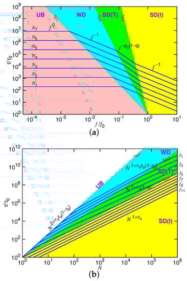 In the figure, the force regimes are demarcated by the three lines: , and with , , and . The slopes of the lines satisfy the order , if and . Please notice that the UB regime shrinks completely and, thus, is just a line in the figure. This is because and have the same exponent when scaling with N. To show the influence of the driving force, we have drawn the curve versus N by doubling f in the way . In each force regime, the time curves show parallel lines. Sine , the exponent of the curve in the WD regime is larger than the one in the SD(T) regime. Therefore, the gap of the parallel lines increases when the curves enter from the WD to the SD(T) regime. When entering later into the SD(I) regime by increasing N, the exponent increases. The gap of the lines is thus narrowed down.