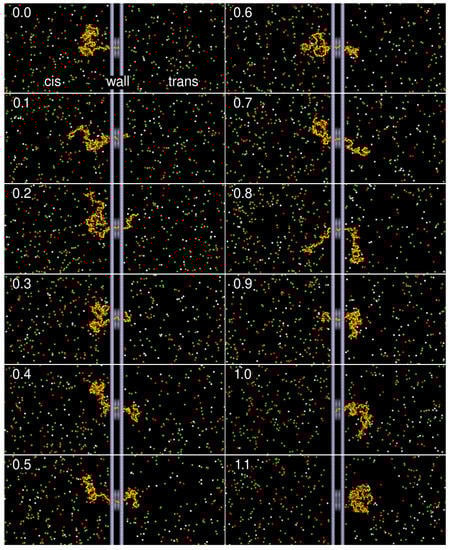- Kapahnke, F.; Schmidt, U.; Heermann, D.W.; Weiss, M. Polymer translocation through a nanopore: The effect of solvent conditions. J. Chem. Phys. 2010, 132, 164904. [Google Scholar] [CrossRef] [PubMed]