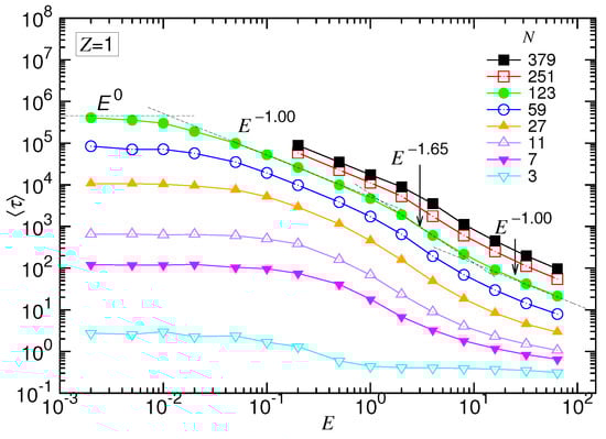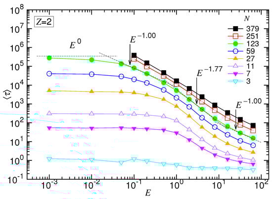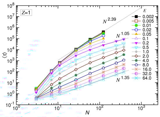 Concerning the dependence of N, we observed again the set of the curves upper-bounded by a line in the log-log plot, which was . It describes the limiting situation taking place in a negligibly weak driving field, i.e., the UB force regime. By increasing E for large N, the variation of exhibited the featured behaviors. It allowed determining the exponent for the SD(T) regime and for the SD(I), which were and , respectively. The results gave and .