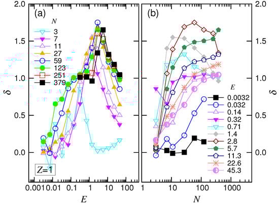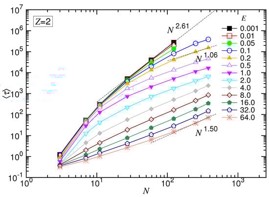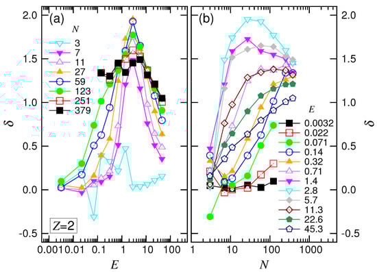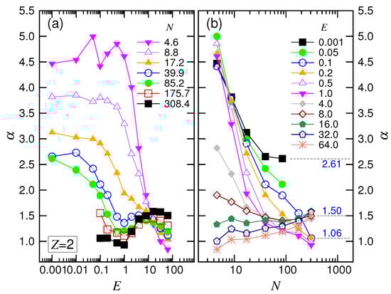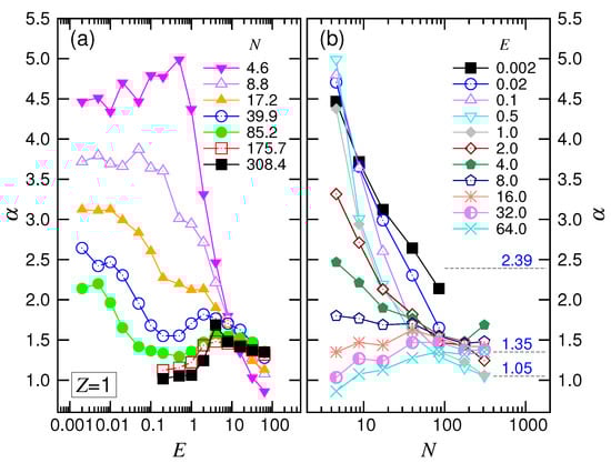 To understand how and vary with E and N, we calculated the scaling exponents from pairs of the adjacent data on the curves in the above two figures. The results are presented in Figure 6 and Figure 7.