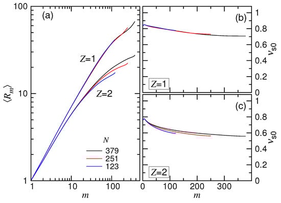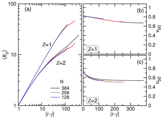The size scaling of chain blobs was studied by the simulations using charged chains in free solutions. The exponent depicts the scaling of the mean distance of a pair of monomers i and j via the relation where is the number of the bonds that connect the two monomers. Again, the notation is used, rather than , to emphasize that the exponent was obtained under the static condition. The log-log plot of vs. is presented in Figure 13a. The exponent calculated by are presented in Panels (b) and (c) of the figure for the and salt cases, respectively, where .