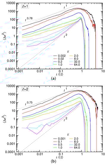 We calculated for in the monovalent and divalent salt solutions, and the results are presented in Figure 14a,b. Because the duration of translocation depends on E, the curves are plotted against the normalized time , rather than t, in order to compare them over different driving fields.