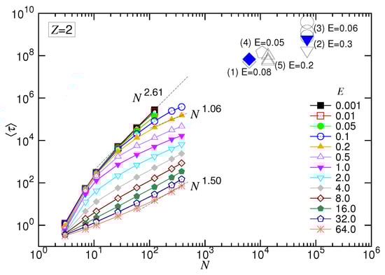 The scaling theory stated that the translocation time was upper bounded by a UB line given by . By increasing the driving force, the exponent decreased by one as the system entered the WD regime. It then changed to in the SD(T) regime and, finally, increased to in the SD(I) regime. Our simulations did show the existence of such an asymptotic UB line, which scaled as extracted by a least-squares fit from the last three data at , 59 and 123. Increasing E reduced at a given N, and the scaling exhibited the characteristic variations: decreased first and then increased. We studied the changes of the exponent. The exponent extracted from the data , 251 and 379 gave a value of for the SD(T) regime and for the SD(I) regime, as shown in the figure.
