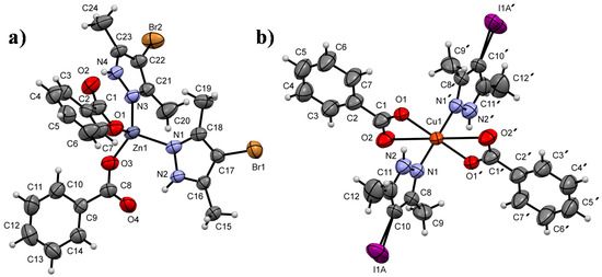 Single crystals of 1 and 4 were obtained by slow diffusion of a saturated diethyl ether solution over a separated portion of tetrahydrofuran in a confined crystallization chamber. The crystallographic data for complexes 1 and 4 are summarized in Table 3. The molecular structures of both complexes are considerably different, despite the similarity of the ligands. A benzoate group is common to both compounds, and the pyrazole derivatives differ only by the halogen substituents, Br and I in compounds 1 and 4, respectively. In structure 1, the central Zn atom is coordinated to two equivalent Br-pyrazole units and two benzoate moieties. This four-coordination geometry describes a tetrahedral polyhedron [35,36] with an average volume of 1331.3(4) Å3 and a mean tetrahedral quadratic elongation of λ = 1.005 (Figure 3a). In the case of compound 4, the structure is characterized by a six-coordination geometry that is exhibited by the metal. The central Cu-cation is coordinated to two benzoate groups and two I-pyrazole units forming an octahedral configuration with an average volume of 5489.1(11) Å3 and a mean octahedral quadratic elongation of λ = 1.246 (Figure 3b). From a general point of view, the central metallic atoms in both molecules are coordinated to the same number of ligands. However, the benzoate fragment shows monodentate and bidentate behaviors in compounds 1 and 4, respectively. This difference could be a result of the conformational distribution of the cis and trans ligands for structures 1 and 4, respectively (see Figure 3). In the case of compound 4, the crystal has a Z′ value of 0.5, which is due to the coincident symmetry of the molecule with an inversion center that is present at the center of the molecule at (1/2, 1/2, 0). This point of symmetry relates the pyrazole and benzoate ligands in the trans conformation. These structural characteristics influence not only the molecular conformation of 1 and 4 but also their supramolecular arrangements. The intramolecular hydrogen bonds N2–H2···O4 and N4‒H4A···O2 have a strong interaction in the molecular structure of 1 with short H···O distances (1.85–1.86 Å), whereas the intramolecular C9‒H9A···O1i [symmetry code: (i) 1−x,1−y,−z] hydrogen bonds interact in the conformation of 4 with H···O short distances (2.39 Å), but to a lesser extent compared with compound 1.