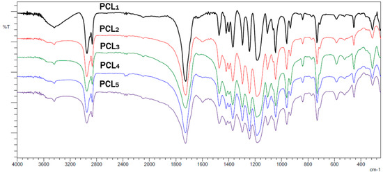 FTIR spectra of the obtained polymers exhibited absorption bands that correspond to a linear aliphatic polyester. Figure 5 shows the FTIR spectra of the PCLs obtained.
