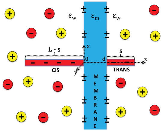 The charge composition of the system is depicted in Figure 1. The membrane of thickness d, surface charge of arbitrary sign, and dielectric permittivity are immersed in the monovalent electrolyte NaCl of concentration and dielectric permittivity . We note in passing that, in our article, the dielectric permittivities are expressed in units of the vacuum permittivity . Moreover, the membrane contains a pore oriented along the z-axis. The externally applied voltage between the cis and trans sides of the membrane induces a uniform electric field in the pore. This field exerts a constant force on the polymer portion enclosed by the nanopore. We note that the detailed formulation of the pore electrohydrodynamics would be necessary to relate quantitatively the force to the external electric field, the polymer charge, the ion density, and the electroosmotic flow. As this task is beyond the scope of the present work, the pore electrohydrodynamics will be coarse-grained and the drift effect on the polymer translocation will be described solely in terms of the driving force .