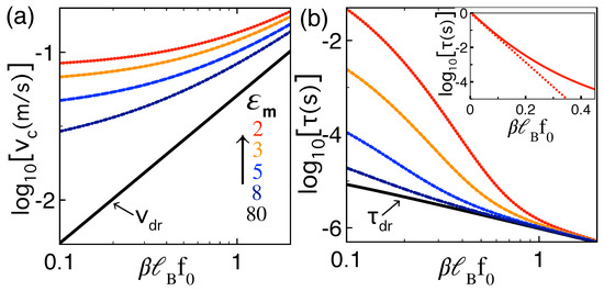 (color online) (a) polymer capture velocity (14) and (b) translocation time (16) versus the dimensionless external force in the dilute salt regime and at various membrane permittivity values given in the legend of (a). The black curve in (b) corresponds to the drift limit Equation (25) of the translocation time. The polymer length and membrane thickness are nm and nm. The pore friction is switched off, i.e., . The inset in (b) displays in a semilogarithmic plot the exponential regime of the translocation time for .