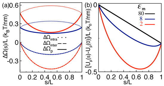 In Equation (A31), the term is the interaction energy between the polymer and membrane charges. The second component corresponds to the polymer self-energy accounting for the polarization forces induced by the dielectric contrast between the membrane and the solvent. Below, we review briefly the computation of these two potential components previously derived in Ref. [22]. The electrostatic potential will be obtained from the grand potential (A31) at the end of Appendix D.2.
