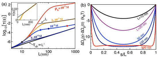 The quick rise of the translocation time with the polymer length continues up to the characteristic length whose numerical value is given in the caption of Figure 4. corresponds to the critical polymer length beyond which electrostatic polymer–membrane interactions saturate. More precisely, due to salt screening, the trans-cis portions of the polymer separated by a distance larger than interact weakly. As a result, the depth of the dielectric trap is mostly invariant by the extension of the polymer length beyond (see Figure 4b). Thus, for , the value of the double integral in Equation (16) is not significantly affected by the length L, i.e., . This results in the linear rise of the translocation time with the polymer length (see also the inset of Figure 4a), i.e.,