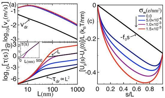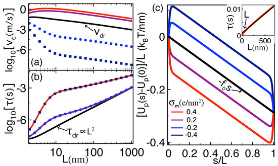 One first notes that, upon the increase of the cationic membrane charge, the onset of the polymer–membrane attraction significantly deepens the trapping potential . This enhances the translocation time of long polymers by orders of magnitude, i.e., for nm. However, one also sees that, at the beginning of the translocation corresponding to the polymer capture regime , the slope of the polymer potential is weakly affected by the increment of the membrane charge density. As a result, the dielectrically enhanced capture velocity remains practically unaffected by a weak membrane charge. Finally, Figure 5b shows that the linear scaling of the translocation time with the polymer length remains unchanged by the surface charge, i.e., for (see also the inset). One however notes that the finite membrane charge shifts the regime of linearly rising translocation time to larger polymer lengths, i.e., .