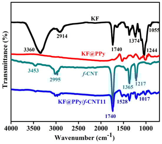 FTIR spectra of KF, KF@PPy, f-CNT, and KF@PPy/f-CNT11.