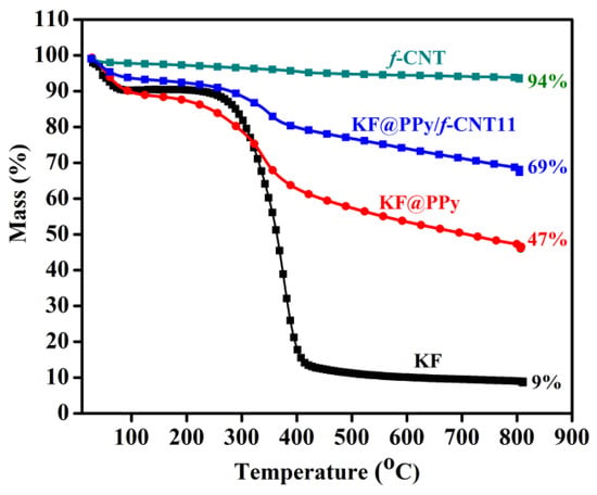 The thermal stability of the KF, KF@PPy, f-CNTs, and KF@PPy/f-CNT composite films was examined through TGA under N2 over the temperature range 30–800 °C (Figure 2). In the TGA curve of KF, the weight loss during the first stage, from ambient temperature to 100 °C, is assigned to the dehydration of KF, including water molecules that had been absorbed to the KF and those derived from the OH groups [30]. The dramatic weight loss during the second period (280–400 °C) is ascribed to the destruction of the crystalline region of the KF cellulose and amorphous cellulose into d-glucopyranose and free radicals [28]. The KF@PPy composite underwent a much lower weight loss relative to KF, where 47% of the mass was preserved at 800 °C—suggesting good thermal stability for the KF@PPy composite. The TGA curve of the KF@PPy/f-CNT11 composite reveals an increased amount of residue when compared with that of the KF@PPy composite, due to the presence of the highly thermally stable f-CNTs. The weight residue of the KF@PPy/f-CNT11 sample was 69%, indicating its excellent thermal stability under high temperature.
