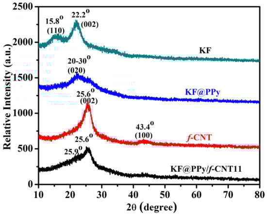 XRD patterns of KF, KF@PPy, f-CNTs, and KF@PPy/f-CNT11.