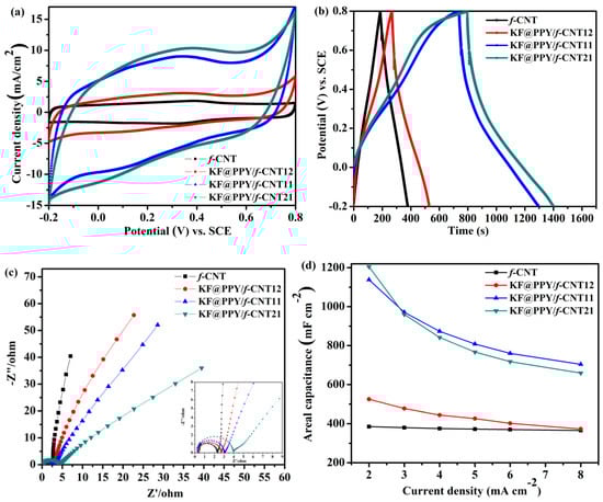 Electrochemical characterization of pure f-CNT and KF@PPy/f-CNT freestanding hybrid electrodes prepared at various weight ratios (1:2, 1:1, 2:1): (a) cyclic voltammetry (CV) curves (scan rate: 5 mV s−1); (b) galvanostatic charge/discharge (GCD) curves (current density: 2 mA cm−2); (c) Nyquist plots (frequency range: from 0.01 Hz to 100 kHz), and (d) capacitance retention at various current densities.
