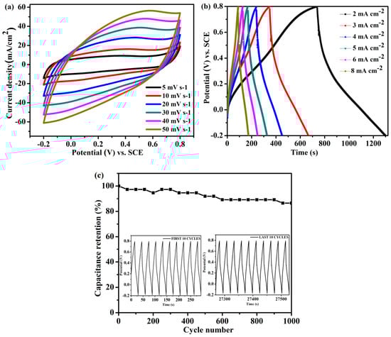 Figure 6a,b present CV curves recorded at various scan rates and GCD curves recorded at various current densities, respectively, of the KF@PPy/f-CNT11 freestanding electrode. The CV curves retained their highly symmetrical shape at all scan rates, indicating the excellent rate capability of the KF@PPy/f-CNT11 freestanding electrode. This behavior was confirmed by the GCD curves, which retained similar shapes at all current densities. Moreover, the IR drop of the KF@PPy/f-CNT11 freestanding electrode was small, indicative of high conductivity and low charge transfer resistance, even though no additional current collectors were used. Cycling stability is an important parameter for the practical application of any SC in an energy storage device. Most conducting polymers exhibit rapid capacitance decay during repeated charge/discharge processes, due to the large volume change resulting from the rapid redox reactions between the electrode materials and the electrolytes [47]. To evaluate the long-term cycling stability of the KF@PPy/f-CNT11 freestanding electrode, a charge/discharge test was performed for 1000 cycles at 25 mA cm−2 (Figure 6c). After 1000 cycles, the freestanding electrode retained approximately 86.5% of its initial capacitance, indicating its excellent cycling stability. Thus, the KF cellulose can efficiently accommodate the volume change of the PPy during the charge/discharge cycles.