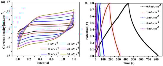 The electrochemical properties of the freestanding electrodes were tested using cyclic voltammetry (CV), galvanostatic charge/discharge (GCD), and electrochemical impedance spectroscopy (EIS) techniques on a CHI6273D electrochemical work station (CH Instruments, Inc., Austin, TX, USA). A three-electrode system was used to evaluate the performances of the as-prepared composites in aqueous 1 M H2SO4. A piece of the freestanding film (active area: 1 cm2) was used directly as the working electrode. A saturated calomel electrode (SCE) and platinum foil were used as the reference and counter electrodes, respectively. CV was performed in the voltage range from −0.2 to +0.8 V at scan rates of 5, 10, 20, 30, 40, and 50 mV s−1. EIS was performed at the open-circuit potential with an amplitude of 5 mV over a frequency range from 0.01 Hz to 100 kHz. The GCD experiments were performed in the potential window from −0.2 to +0.8 V with applied current densities of 2, 3, 4, 5, 6, and 8 mA cm−2. Areal capacitance of the freestanding electrodes were calculated from their CV data, according to the Equation (2):
