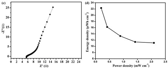 EIS was used to further evaluate the electrochemical performance of the electrode materials of the SC device in the frequency range from 0.01 to 100 kHz, with an AC perturbation of 5 mV; the corresponding Nyquist plot (–Z´´ vs. Z´ plot) is presented in Figure 7c. The intercept of the Nyquist plot with the real axis at high frequency indicates the internal resistance, also known as the solution resistance (Rs), of the SC; it is related to the resistance of the electrolyte, the contact resistance between the electrode and current collector, and the intrinsic resistance of the active material. The calculated value of Rs of the SC was 5.5 Ω; it is most likely associated with the intrinsic resistance of the gel electrolyte. The charge transfer resistance (Rc), indicated by the diameter of the semicircle in the high-frequency region, was approximately 3 Ω. In the low-frequency range, the Nyquist plot of the SC featured an almost vertical line, indicating near-ideal capacitive behavior because of the faster ion transport at the electrode–electrolyte interface. This excellent ion diffusion in the KF@PPy/f-CNT11–based SC was due to the highly porous microstructure formed by the KF@PPy and f-CNT interconnected network. The pores in the unique porous structure of the hybrid electrode acted as electrolyte ion reservoirs; they shortened the ion diffusion distance by providing good diffusion channels for electrolyte ions. Thus, the accessibility of electrolyte ions was improved, as well as allowing more efficient utilization of PPy and f-CNT. Moreover, the Ragone plot of the assembled all-solid-state symmetric device exhibited (Figure 7d) a maximum areal energy density (volumetric energy density) of 22.3 µW h cm−2 (297.3 µW h cm−3) at an areal power density (volumetric power density) of 0.21 mW cm−2 (2.8 mW cm−3), and maintained an energy density of 11.1 µW h cm−2 (148 µW h cm−3) at a maximum power density of 2.1 mW cm−2 (28 mW cm−3). These values indicate the superior rate capability of the assembled device and its potential for storing and delivering energy at rapid rates. The areal/volume capacitance, maximum areal/volumetric energy density, and power density of the KF@PPy/f-CNT11 SC surpass those achieved for many previously reported all-solid-state symmetric SCs, and even some asymmetric SCs (see Table S2).