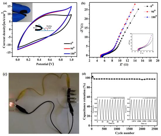The flexibility and mechanical stability of the assembled all-solid-state symmetric SC were assessed by bending it from 0° to 180°. As displayed in the inset to Figure 8a, the assembled SC was highly flexible and was readily bent to large angles without causing any mechanical damage. The changes in the electrochemical properties of the SC during the bending process were examined using CV and EIS (Figure 8,b, respectively). Interestingly, in contrast to most previous reports of a slight decrease in the electrical electrochemical properties of the SCs after bending, the electrochemical performance of our SC improved after bending, as indicated by the increase in the CV enclosed area. As a result, the areal capacitance of the device increased from 128.4 mF cm−2 at 0° to 137.4 mF cm−2 at 90° and to 139.4 mF cm−2 at 180°. This increase in the areal capacitance could be explained by a decrease in the contact resistance between the electrode materials and the gel electrolyte, as indicated by the low contact resistance and diffusion resistance in the EIS spectra during the bending process. In addition, the compression of the electrodes of the SC that occurred during the bending process might have acted as an external pressure applied to the device, resulting in increased intimate contact between the PPy and f-CNT and, eventually, shortening the distance for charge carrier transportation. In addition, the impedance curves of the SC measured under bending conditions featured a more vertical line parallel to the imaginary axis in the low-frequency region, suggesting improved capacitance behavior. The excellent flexibility of our KF@PPy/f-CNT hybrid film–based symmetric SC suggests that it had great promise to be applied in wearable/portable flexible electronics. To demonstrate its practical applications in flexible and portable energy storage systems, three pieces of the as-fabricated flexible all-solid-state SCs were connected in series to power two red LEDs (Figure 8c). Long term cycling stability is a crucial parameter for the practical applications of an all-solid-state SC in portable electronics. To check the electrochemical stability of our device, a GCD test was performed at 25 mA cm−2 for 2500 cycles (Figure 8d). The use of the PVA/H2SO4 gel electrolyte greatly enhanced the cycle life of the all-solid-state KF@PPy/f-CNT11 hybrid SC; the capacitance retention was 97.4% after 2500 cycles. The first and last 10 cycles (inset to Figure 8d) provided nearly identical charge discharge curves, confirming the superior cycling stability of the all-solid-state device. The excellent cycling behavior of this solid-state device is ascribed to the highly conductive unique porous structure of the KF@PPy/f-CNT11 hybrid electrode, not only ensuring rapid ion transport but also helping to buffer the volumetric change caused by the ion doping and de-doping of the PPy during the charge/discharge process. These results indicate the promising potential of highly conductive and freestanding KF@PPy/f-CNT electrodes for use in the fabrication of environmentally friendly, lightweight, inexpensive, highly flexible, high-performance SCs, with applications in portable and flexible electronic gadgets.