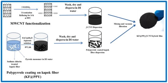 CNTs were obtained from C-nano Technology (Beijing, China). KF (Ceiba pentandra) was purchased from Uni-onward (New Taipei City, Taiwan). Pyrrole (Alfa Aesar, 98%, Heysham, Lancashire, UK) was distilled under reduced pressure and stored at low temperature under a N2 atmosphere prior to use. Ferric chloride hexahydrate (FeCl3·6H2O) purchased from Sigma–Aldrich (St. Louis, MO, USA). Sodium chlorite (NaClO2) and nitric acid (HNO3) were procured from Showa Chemical Industry (Tokyo, Japan). Acetic acid (CH3COOH), sulfuric acid (H2SO4), and PVA were purchased from Sigma–Aldrich (St. Louis, MO, USA) and used as received. High-purity deionized water was used in all experimental processes.
