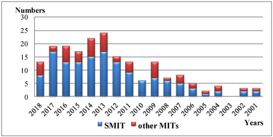 The annual numbers of journal publications on SMIT and other MITs from 2001 to 2018 (originated from Web of ScienceTM) via searching publications including “TiO2 molecular imprint” and “TiO2 surface molecular imprint” (SMIT) in the topic.