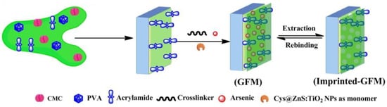 Yao et al. [33] synthesized TiO2 hybrid molecular imprinted polymer by using bensulfuron-methyl (BSM) as the template molecule, methacrylic acid (MAA) as the functional monomer, and silane coupling agent 3-(trimethoxysilyl) propylmethacrylate (KH570) as organic–inorganic connective bridge. The obtained MIPs have stable chemical property, high mechanical strength, large specific surface area and adsorption capacity, good selectivity and easy desorption. Roy et al. [34] fabricated a membrane which exhibited high adsorption capacity with outstanding specific selectivity towards As (III) and As (V). They used a cysteine (Cys) derivative modified TiO2 doped ZnS nanoparticle (Cys@ZnS:TiO2 NPs) as the monomer. The selective he membrane was prepared by the combination of ‘grafting-from’ and MIT (Figure 2). In this procedure, acrylamide (AA) was firstly mixed with membrane precursors (carboxymethyl cellulose, CMC and polyvinyl alcohol, PVA) to form a base membrane. Then, a pre-polymer mixture which contained template (As (III) or (V)), functional monomers Cys@ZnS:TiO2NPs), cross-linker (N-N′-methylene bisacrylamide) and an initiator (APS) was added to the base membrane to generate the imprinted membrane. The adsorption capacity of this membrane towards As (III) and As (V) is 151.0 and 130.0 mg/g, respectively. Yang et al. [35] prepared a chemiluminescent sensor based on nitrobenzoxadiazole(NBD)-grafted anatase nanoparticles for detecting phenoxyacetic acid compounds sensitively and selectively, such as the herbicide 2,4-dichlorophenoxyacetic acid. This chemiluminescence sensor was constituted of anatase nanoparticles grafted with the NBD fluorophore and bis(2,4,6-trichlorophenyl)oxalate (TCPO. Firstly, anatase TiO2 nanoparticles were functionalized with a hybrid monolayer of the NBD fluorophore and amino groups, then it was covalently linked with 3-aminopropyltriethoxysilane (APTS) by a nuclephile reaction. The sensor had a very low detection limit of 0.33 nM and can promote the development of sensors based chemiluminescent nanomaterials.