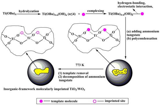 Takahara et al. [40] deposited β-cyclodextrin/bisphenol A (β-CD/BPA) complex and Ti(O-Bu-n)4 alternately on a quartz crystal microbalance (QCM) to prepared the bisphenol A imprinted TiO2 film by sol-gel method. The imprinted TiO2/(β-CD/BPA, 2:1) film showed about 7-fold higher selectivity than the non-imprinted TiO2/beta-CD film and a sensitivity lower than 50 ppb to BPA. Wei et al. [41] utilized the inorganic Fe3O4@SiO2 composite as the imprinted matrix, 4-nitrophenol as a template molecule, and Ti(oBu)4 as a cross-linking agent to prepare the final core-shell molecularly imprinted TiO2/WO3-coated magnetic nanocomposite. The degradation rate of this composite for 4-nitrophenol was 2.5 times that of the non-imprinted nanocomposite. Luo et al. [42] prepared inorganic-framework molecularly imprinted TiO2/WO3 nanocomposites with molecular recognitive photocatalytic activity using the sol-gel method by using 2-nitrophenol and 4-nitrophenol as template molecules and tetrabutylorthotitanate as a titanium source and the precursor to functional monomer (Figure 4). The molecularly imprinted TiO2/WO3 exhibits higher stability and selective than non-imprinted TiO2/WO3. Cai et al. [43] used metallothionein (MT) as template and TiO2 sol as imprinting matrix to synthesize MT blotted TiO2 films by surface sol-gel method. According to Li et al. [44], SMIT combined with sol-gel process was applied to synthesis a new Pb(II)-imprinted polymer with nano-TiO2 as a solid substrate, glycidoxy propyltrimethoxysilane (GPTMS) as both a crosslink and a silane coupling agent. Song et al. [45] prepared the new molecularly imprinted inorganic-framework Fe–TiO2 composites (MIPs/Fe–TiO2) based on the sol-gel method with acid orange II (AOII) as the template molecule and TiO2 as the matrix material. Liu [46] used nnthracene-9-carboxylic acid as the imprinting molecular to construct a novel molecularly imprinted TiO2 thin film modified TiO2 nanotube array photocatalyst by the sol-gel method. Compared with unmodified TiO2 nanotube and non-imprinted TiO2 film modified TiO2 nanotube, the MIPs modified TiO2 nanotube has higher adsorption capacity for target pollutants and enhanced photocatalytic activity in the photodegradation of pollutants.