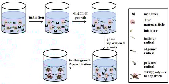 Schematic depiction of the seeded precipitation polymerization mechanism: (1) homogeneous solution of monomers, TiO2 seeds and initiator molecules; (2) Thermal decomposition of the initiator leads to initiator radicals; (3) oligomer radicals’ growth; (4) growth of polymer radicals and phase separation; (5) precipitation of oligomer/polymer radicals onto the surface of the TiO2 nanoparticle seeds. Adapted from ref [65].