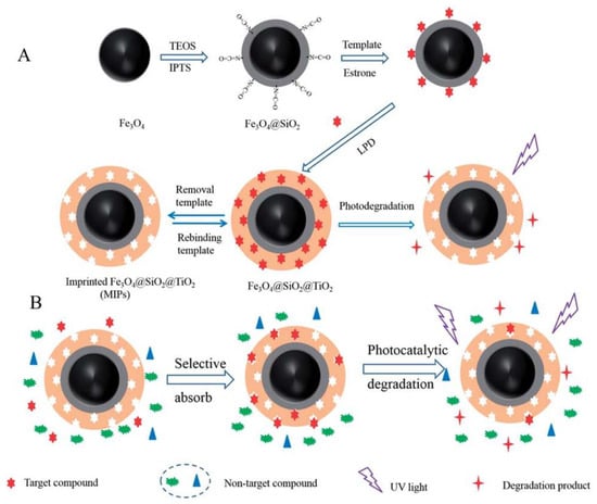 Environmental Estrogens (EEs) endanger the body’s endocrine system and affect the growth and reproductive functions of humans and animals [94]. Removing estrogenic chemicals from wastewater is a matter of great concern. Xu et al. [62] used estrone as the template molecule to prepare molecularly imprinted TiO2 hybridized magnetic Fe3O4 nanoparticles by a LPD method. The estrone can be selectively degraded and removed under the irradiation of UV light (Figure 7). The obtained Fe3O4@SiO2@imprinted TiO2 demonstrated high adsorption and capacity selectivity, fast kinetics and excellent stability during long-time photocatalysis. The theoretical maximum adsorption amount of EESs on the Fe3O4@imprinted TiO2 was 2.62 mg/g. This material can provide a potential application prospect for photocatalytic degradation and removal of trace target organic pollutants in the presence of high-level pollutant. Zhang et al. [85] took precipitation polymerization to synthesize the imprinted polymer-modified TiO2 nanotubes (S-MIP-TiO2 NTs) by using 17β-estradiol as the template, MAA as the functional monomer, trimethylolpropanetrimethacrylate as the crosslinking agent, 4,4′-azobis (4-cyanovaleric acid) as the initiator. The experimental results showed that the adsorption range of S-MIP-TiO2 NTs was from 10 ng/L to 1000 mg/L and the apparent first-order rate constant kinetics (kapp) was 0.0732 min−1 for S-MIP-TiO2 NTs. It demonstrated higher adsorption strength and selectivity for photocatalytic degradation at low concentrations of 17β-estradiol compared with pure TiO2. In addition, S-MIP-TiO2 NTs photocatalyst has excellent regeneration characteristics and is widely used in the treatment of estrogen chemicals in municipal wastewater.