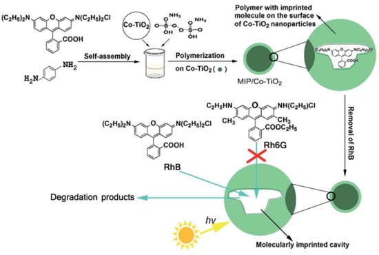 Rhodamine B (RhB) is a kind of typical synthetic cationic dye, which has strong fluorescence in solution. RhB can cause the light transmittance of the water body to drop and destroy the ecological environment even at low concentrations. He et al. [86] used RhB as the template molecule and successfully prepared MIPsRhB–PPy/TiO2 (polyacrylamide/titania) by surface molecular imprinting using RhB as the template molecule. Static and dynamic binding experiments and selective experiments showed that MIPsRhB–PPy/TiO2 had strong affinity and adsorption capacity, fast adsorption rate and good recognition selectivity to RhB. Selective photocatalytic degradation experiments showed that the apparent rate constant of RhB to photodegradation of MIPsRhB–PPy/TiO2 was 0.0158 min−1, 3.6 times higher than that of NIP-PPy/TiO2 (0.0044 min−1). The MIPsRhB–PPy/TiO2 surface was introduced into the imprinting cavity, which had higher photocatalytic selectivity for RhB than NIP-PPy/TiO2 in visible light. In addition, MIPsRhB-PPy/TiO2 had higher reusability and stability. Furthermore, Liu et al. [87] used RhB as the template molecule, OPDA as the functional monomer and APS as the initiator to prepare imprinted polymer-coated Co-doped TiO2 (MIPs/Co-TiO2) nanocomposites by surface molecular imprinting technology (Figure 8). Compared with non-imprinted Co-doped TiO2 nanocomposites (NIPs/Co-TiO2), The k value for the photodegradation of RhB over MIPs/Co–TiO2 nanocomposites was 0.03606 min−1, being 337.3% of RhB over Co–TiO2 nanoparticles (0.01069 min−1) and 215.7% of RhB over NIP/Co–TiO2 nanocomposites (0.01672 min−1), which proved that MIPs/Co-TiO2 nanocomposites showed higher photodegradation and selectivity to RhB. In addition, MIPs/Co-TiO2 nanocomposites exhibited high stability.