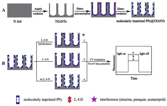 Shi et al. [102] prepared a PEC sensor with a low detection limit based on modified TiO2 nanotubes (TiO2 NTs) to detect 2,4-D (2,4-D, a putative endocrine disruptor which lacks electrochemical activity) selectively and sensitively (Figure 10). The detection range was 0.5–13 μM and the detection limit was 10 nM. Thereafter, Lu et al. [103] fabricated a novel PEC sensor based on vertically aligned TiO2 nanobutes with surface molecularly imprinted PPy to detect another endocrine disruptor BPA. The photocurrent was proportional to the concentration of BPA in the range of 4.5–108 nM, with a detection limit of 2.0 nM. The results showed that the prepared sensor had highly selectivity and sensitivity and can determine BPA from other high concentration substances in water samples. What’s more, the PEC sensor showed good applicability and high stability in real water, which made a successful attempt in developing highly selective and sensitive PEC sensors for endocrine disruptors monitoring.