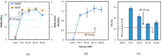Particleboard mechanical properties and thickness swelling are shown in Figure 1. As a control, the board formulated with pure sucrose exhibited MOR of 1.17 MPa but no measurable IB, and the board destroyed after the TS test. This indicates that essentially zero benefit is gained from an adhesive based solely upon sucrose. Beginning with 5 wt % addition of ADP, the mechanical properties measured demonstrated excellent bending performance (MOR 20.76 MPa, MOE 4.7 GPa, IB 1.03 MPa). The MOR, MOE and IB average values exhibited a rising trend as the ADP content was increased from 5–15 wt %, although variance analysis (ANOVA) revealed no significant (p > 0.05) difference of MOE between the particleboards manufactured with SADP 95/5 and 90/10. However, a slightly decrease in board properties was observed from the SADP 80/20 final product. There are possible two reasons caused this observation. First, sucrose was considered to contribute the main bonding strength in this adhesion system, therefore, as the reducing of sucrose content, the physical properties of the particleboard decreased. Secondly, when the proportion between sucrose and ADP at 85/15, the polymerization reaction was sufficient, therefore, when the proportion was 80/20, the added ADP did not participate in the reaction, which led to the physical properties decreasing.