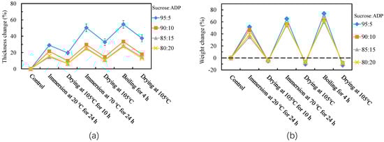 Thickness change (a) and weight change (b) during cyclic aging treatment of the particleboards bonded with SADP adhesives with different proportions. Error bars indicate the standard deviations.