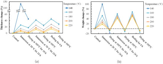 Thickness and weight changes in the cyclic aging treatments are shown in Figure 4. Most of the samples could maintain their shape after the treatments. One exception was observed in the particleboard bonded at 140 °C. A logical explanation for this exception is that this temperature of hot pressing lead to insufficient adhesive curing. The thickness and weight change region of the particleboards decreased with increasing hot pressing temperatures, indicating that temperature is a significant factor for water resistance imparted by the applied SADP 85/15 adhesive. Based on the evaluation results of the particleboard bonded at various conditions, the optimal hot pressing temperature for the tested SADP adhesive was concluded to be 200 °C.