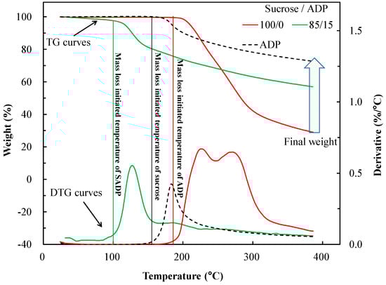 TG and DTG curves of sucrose (100/0), ADP (0/100), and uncured SAPD adhesive (85/15).