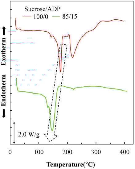 Figure 6 displays DSC curves obtained from pure sucrose and the SADP 85/15 adhesive. First, sucrose alone showed two endothermic peaks located at 180 and 220 °C. Based on the fact that TG analysis did not show any mass loss at 180 °C, those peaks must be due to melting and caramelization of sucrose, respectively [27,31]. For the SADP 85/15 adhesives, it was observed that the addition of ADP resulted in endotherm peaks located at lower temperatures (146 °C). Since the TG analysis showed a mass loss at that temperature, this endothermic reaction is linked with the decomposition of sucrose under the catalysis of ADP. Furthermore, the peaks derived from sucrose were hardly observed over 200 °C, indicating that some endothermic reactions occurred between sucrose and ADP at this temperature.