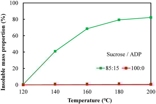 Insoluble mass proportion of SADP 85/15 adhesive and sucrose under different temperatures.