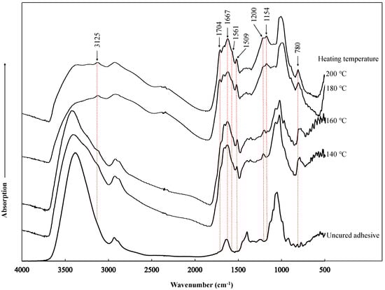 Figure 8 shows the adsorption bands exhibited by the insoluble masses obtained from the SADP 85/15 adhesives which had been heated at different temperatures. Compared to the spectra of the uncured adhesive, 6 new peaks and 1 shoulder were observable, and 1 peak clearly increased in the cured adhesives. Based on our previous research, the new peaks located at around 3125, 1509 cm−1 and the increased peak located at 780 cm−1 were possible due to the C–H, C=C stretching vibration and the CH=CH of furan ring, respectively [23,32,33], considering the 5-HMF itself is a soluble compound, the existence of furan ring in the insoluble mass indicated 5-HMF participated the curing reaction. The peaks located at 1704 and 1667 cm−1 were attributed to C=O derived from carbonyl functionalities [34], which were possible due to the dehydration of sucrose. Another peak observable at 1200 cm−1 was possible attributed to dimethylene ether bridges (–CH2OCH2–) [35]. These peaks indicated that the cured SADP 85/15 adhesive contains furan ring, carbonyl group and dimethylene ether bridges, which were possibly formed by the dehydration of sucrose, while ADP seems to act as a catalyst in the adhesion system. In addition, a new peak located at 1154 cm−1 and a shoulder located at around 1561 cm−1 were also observed through the addition of ADP. The shoulder at 1561 cm−1 was possibly attributed to the N–H stretching and bending vibration [36,37], and the peak at around 1154 cm−1 was possibly attributed to C–N bonds [38]. It seems that nitrogen participated in the polycondensation reaction of SADP adhesive, and this was possible due to the creation of ammonia from the decomposition of ADP. However, it is hard to recognize the existence of nitrogen in the cured adhesive by FT-IR analysis only, further research is needed to clear the chemical structure of the cured SADP adhesive.