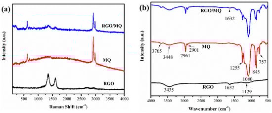 (a) Raman spectra of RGO, MQ and RGO/MQ; (b) Fourier transform infrared spectroscopy (FT-IR) spectra of RGO, MQ and RGO/MQ.