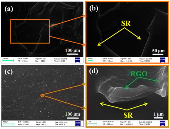 SEM images of (a,b) MQ/SR composites and (c,d) RGO/MQ/SR composites at different magnifications.
