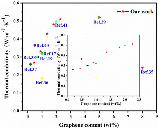 In contrast to other previous work, the results of thermal conductivity show greater improvement, shown in Figure 7. Our work shows thermal conductivity of RGO/MQ/SR composites with a lower graphene content are competitive with those of other graphene/silicone rubber composites previously reported in the literature [17,19,35,36,37,38,39,40,41]. The improved thermal conductivity demonstrates that sandwich-like micro structured RGO/MQ can motivate the dispersion of RGO in the matrix which fully utilizes the thermal conductance of graphene. The achievement of RGO/MQ/SR composites can be exploited for thermal interface materials for thermal management.