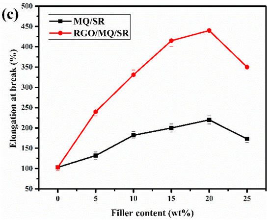 To compare the effect of filler type and content, investigations of mechanical properties of MQ/SR and RGO/MQ/SR composites were conducted. Shore A hardness was tested to assess the ability of composites to resist indentation by a hard object. As can be seen from Figure 8a, Shore A hardness of RGO/MQ/SR composites increases substantially with the increase of content of RGO/MQ in the experimental range, and is up to 254% and 281% harder with 20 and 25 wt % addition, respectively, which is much higher than for the corresponding MQ/SR composites. The excellent mechanical strength and very high aspect ratio of RGO, as the framework introduced into MQ, led to greater reinforcement in the resulting composites [42].