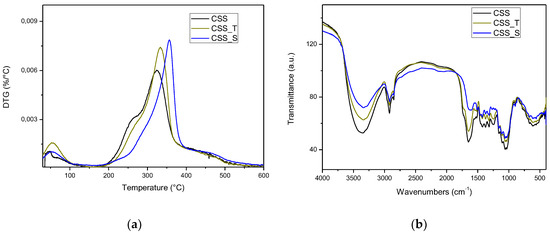 3.1. Chemical, Thermal and Morphological Analysis of Raw and Treated CSS