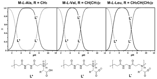 It may be observed that, in case of M-l-Ala, at α > 0.8 the ionization equilibrium of carboxyl groups deviated from that of the same PAAC at lower α values, approaching the normal behavior of polymeric acids [29]. This is probably due to the fact that the α-substituent of alanine is the least bulky and hydrophobic of the series. Probably, at high ionization degrees M-l-Ala is highly hydrated and, consequently, the electrolytic interactions between oppositely charged neighboring groups loosen.